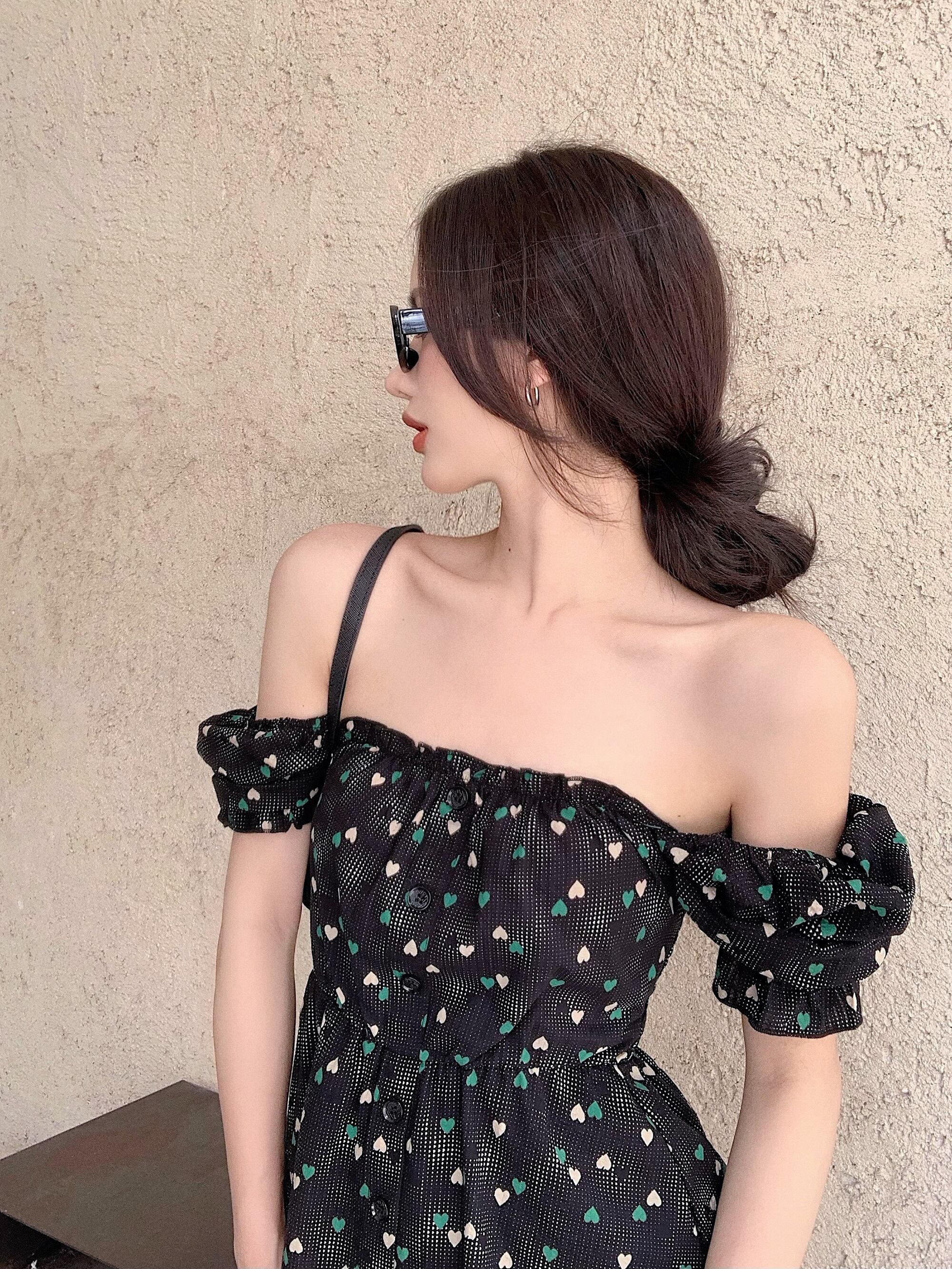 フローラルドレス スリーブブラックショートスカート サマーウェスト 夏物 花柄 ブラックストロベリース64352735238
