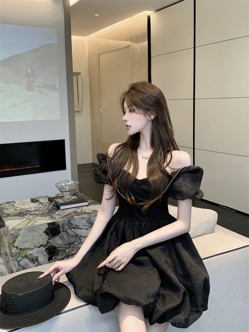 ドレス スタイルブラックショートスカート サマースリーブ ふわふわ 夏物 ブラックストロベリース88466326976