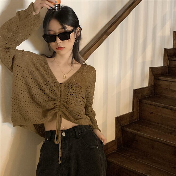 ショートニットセーター Vネックブラウス サマー薄手グリーントップス 夏物 ブラックストロベリース30407255634