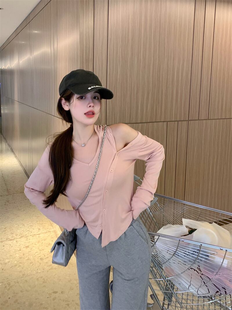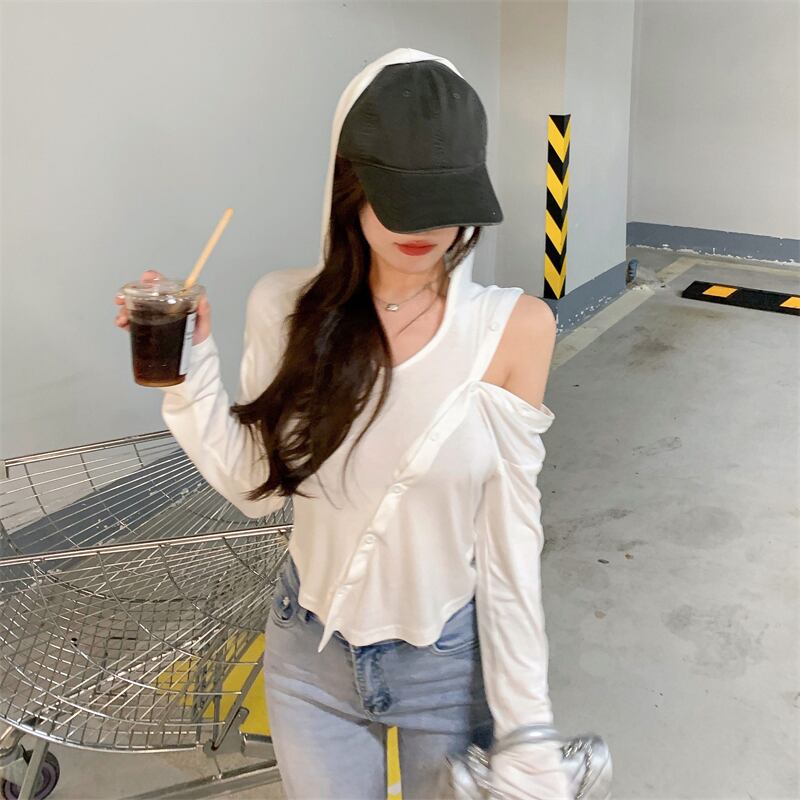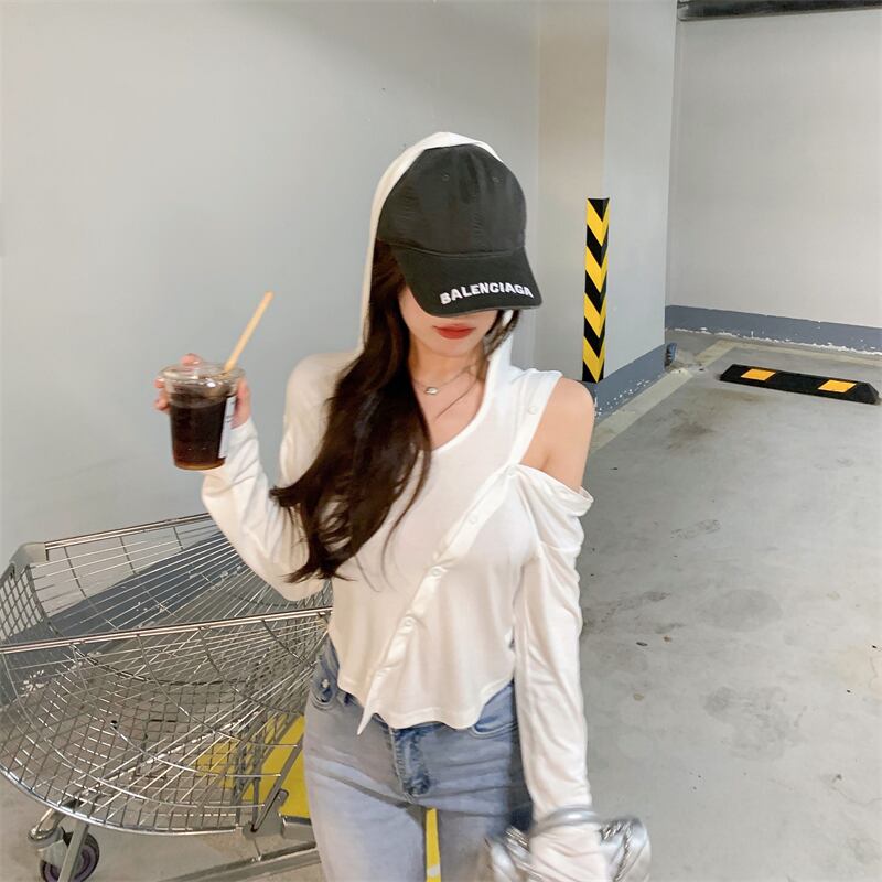Tシャツ シャツ フードサマートップス ロング ピンク 夏物 オフショルダー ピュア ブラックストロベリース87736043403