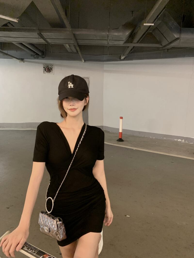 Vネックドレス サマーショートスカート ウェスト 夏物 ブラックストロベリース76662358430