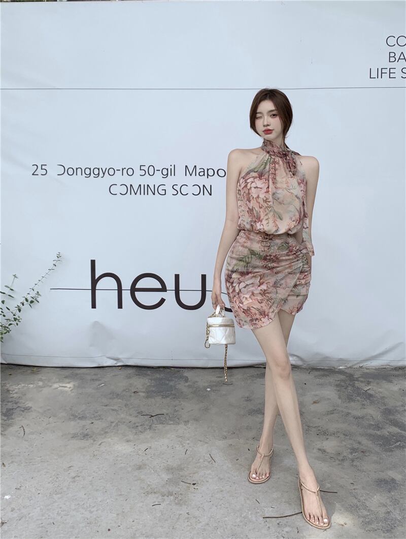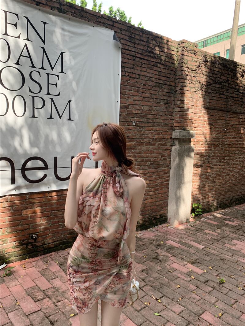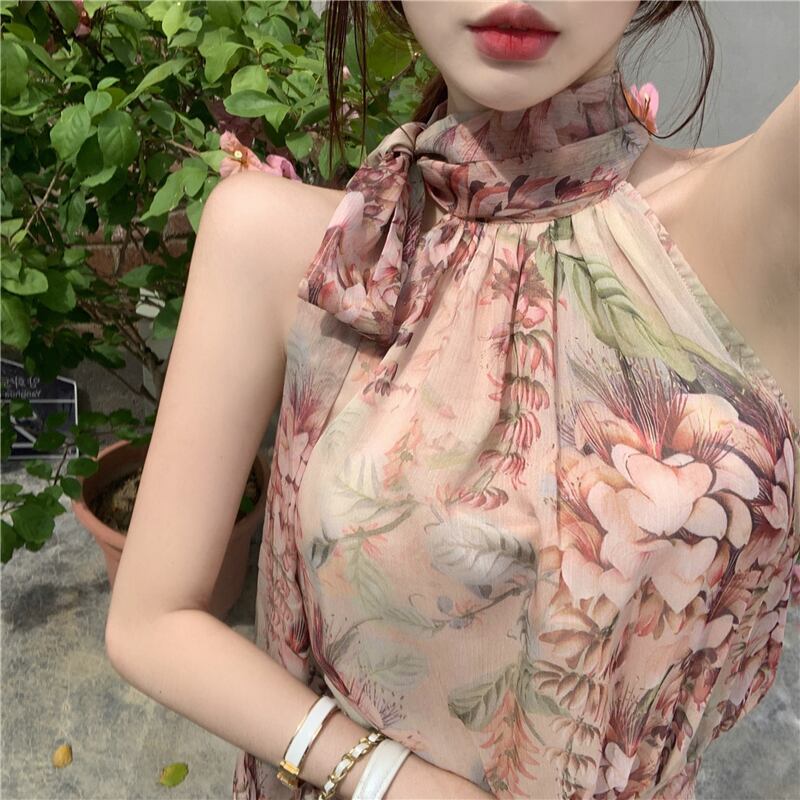 スタンダードストラップレススカート シフォンフローラルドレス サマー薄手ショート レトロ 夏物 花柄 ブラックストロベリース63730095763