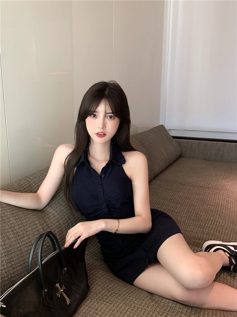 カラーホルターストラップレスノースリーブドレス レディースサマーショートスカート ウェスト薄手 夏物 ブラックストロベリース52510152820