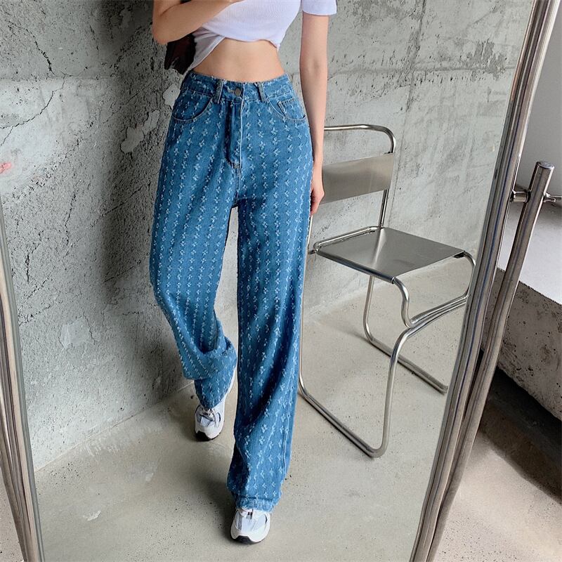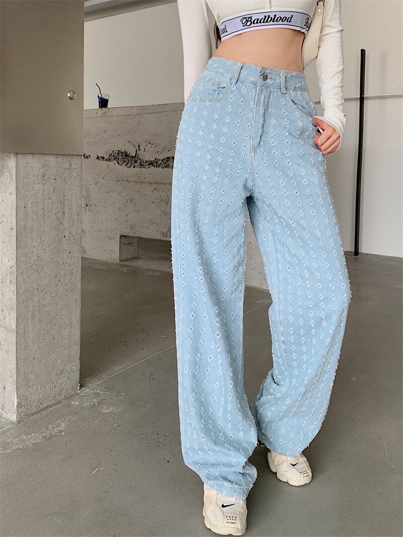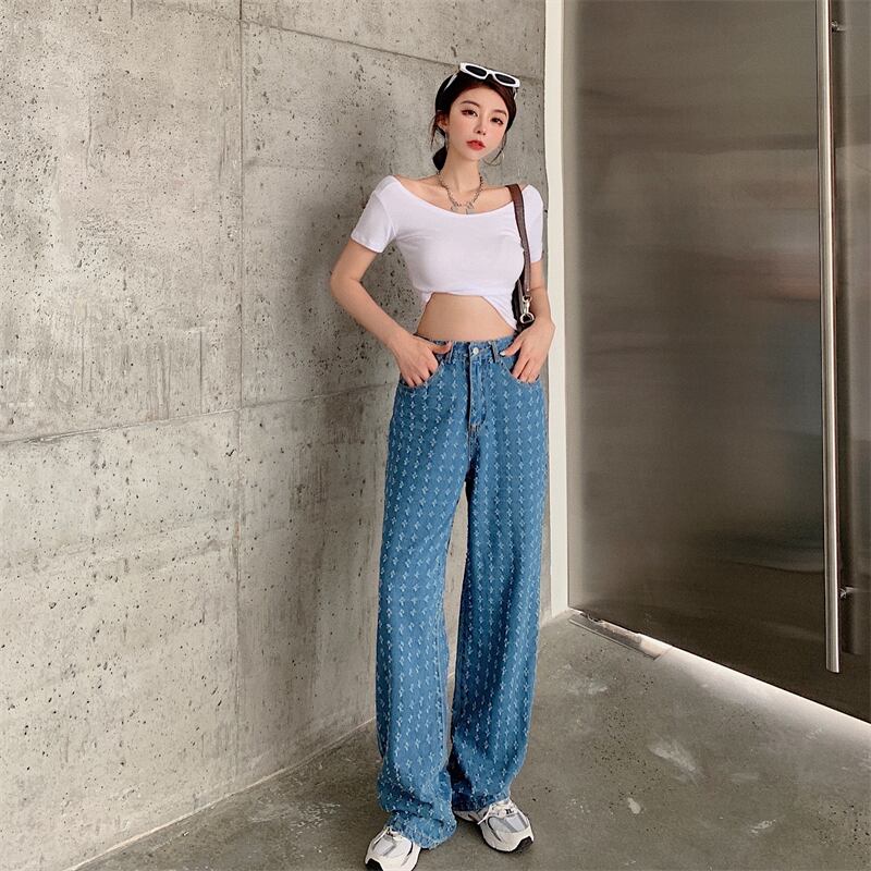 ジーンズ 薄手ハイウェストウェストルーズサマースタイルワイドレッグパンツ 夏物 ワイドパンツ ブラックストロベリース84845875193