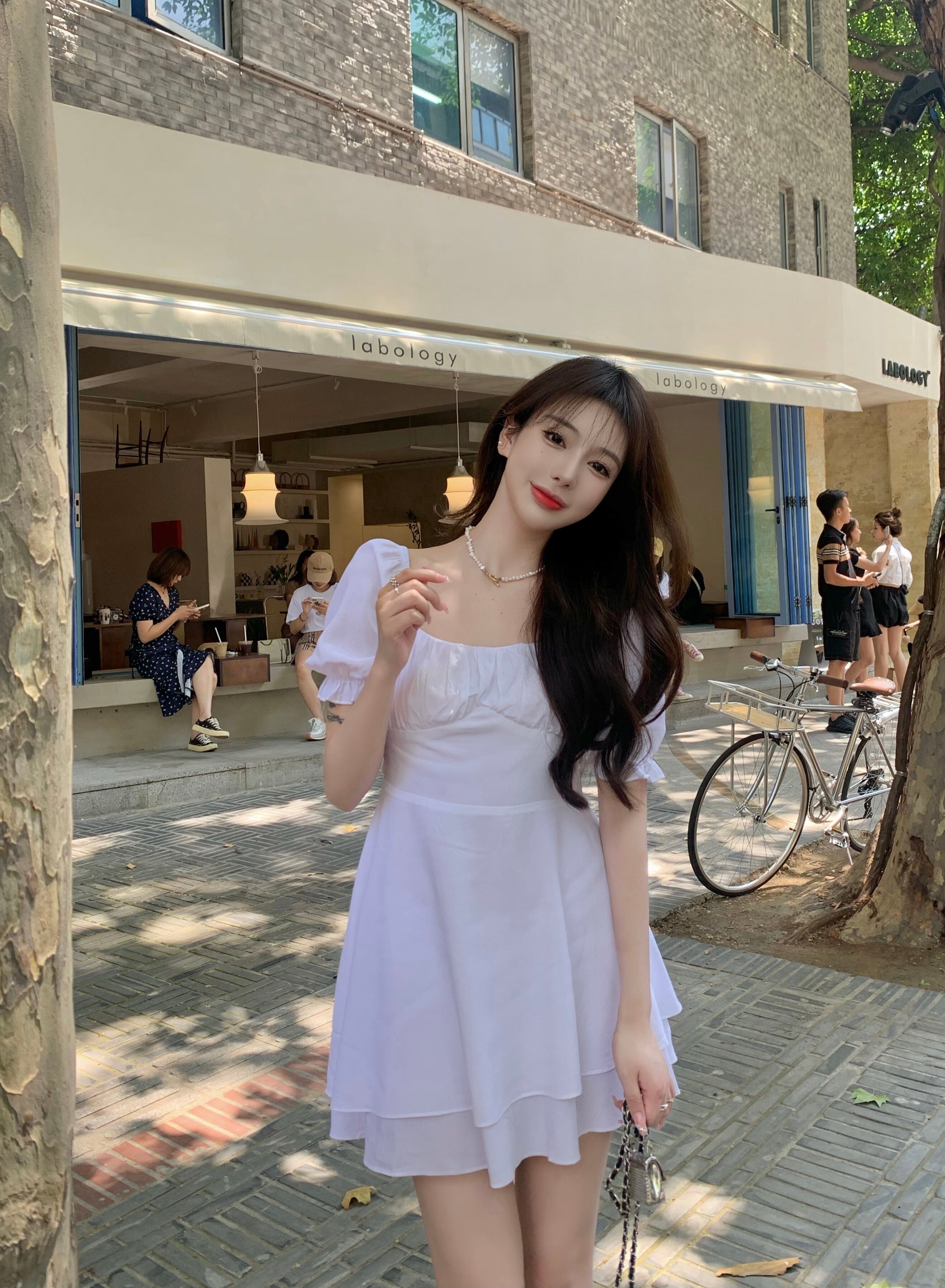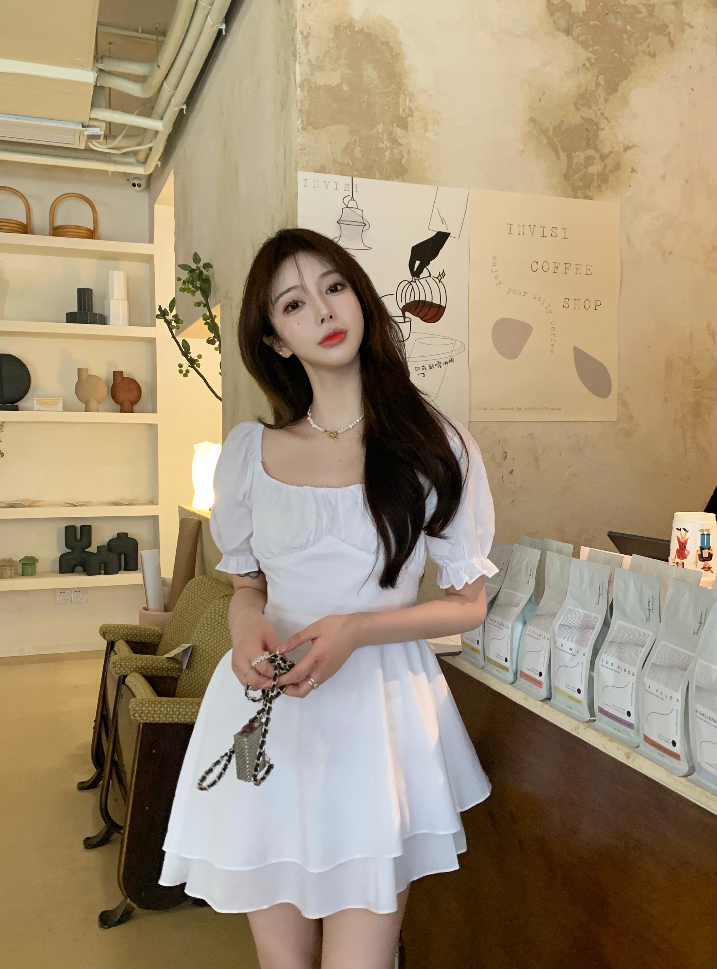 ホワイトウェストスリーブ半袖ドレス サマーカラースカート ショート ハーフスリーブ 夏物 スクウェア ブラックストロベリース80613562558