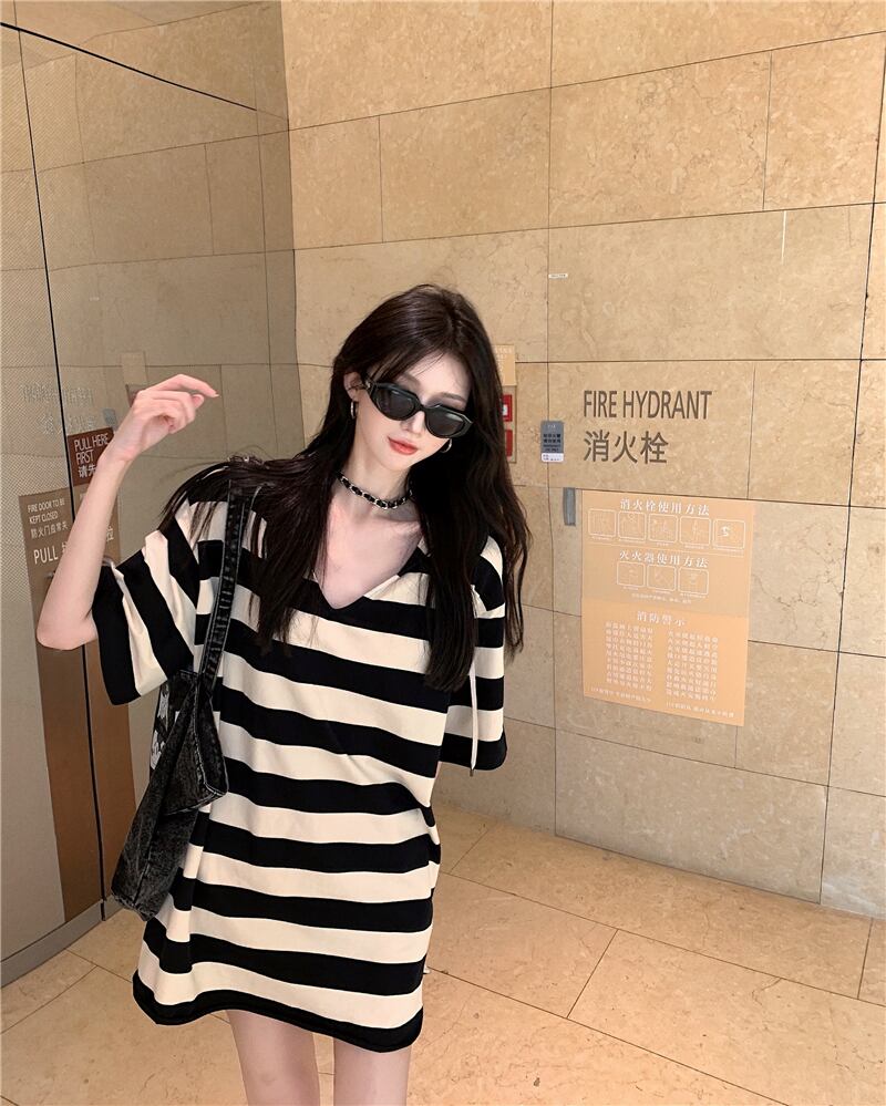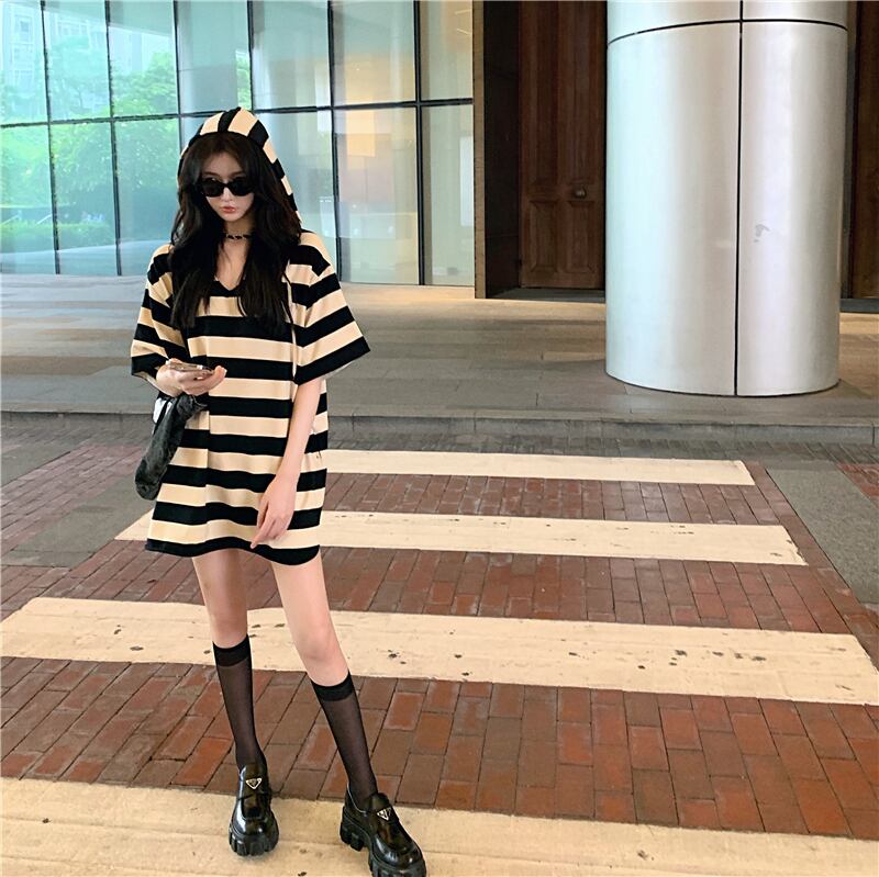 ストライプTシャツ ルーズスタイルフードトップス サマー 夏物 ブラックストロベリース20847132118