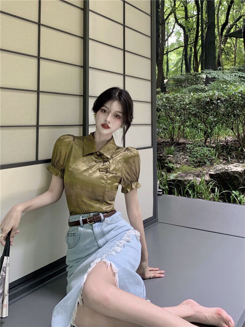 サテンTシャツ ショートグリーンスリーブトップス ブラックストロベリース57010906518