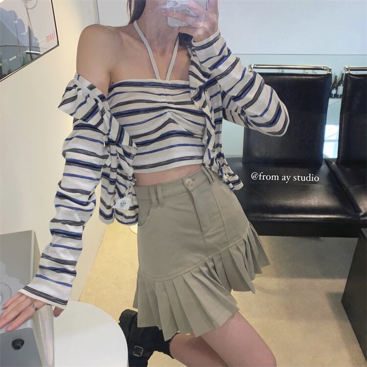 ストライプニットカーディガンジャケット サマー薄手ブラウス ショートトップス ロング 大人ガーリー スウィート キュート カジュアル 夏物 ブラックストロベリース44770259786