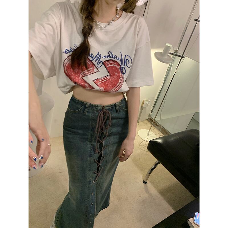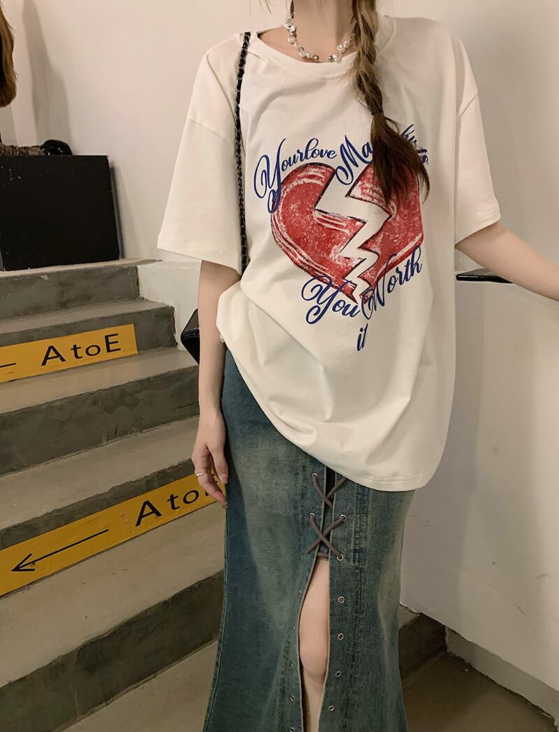 ハートプリントTシャツ サマー薄手カジュアルルーズホワイトトップス 大人ガーリー スウィート キュート 夏物 ブラックストロベリース87422785365