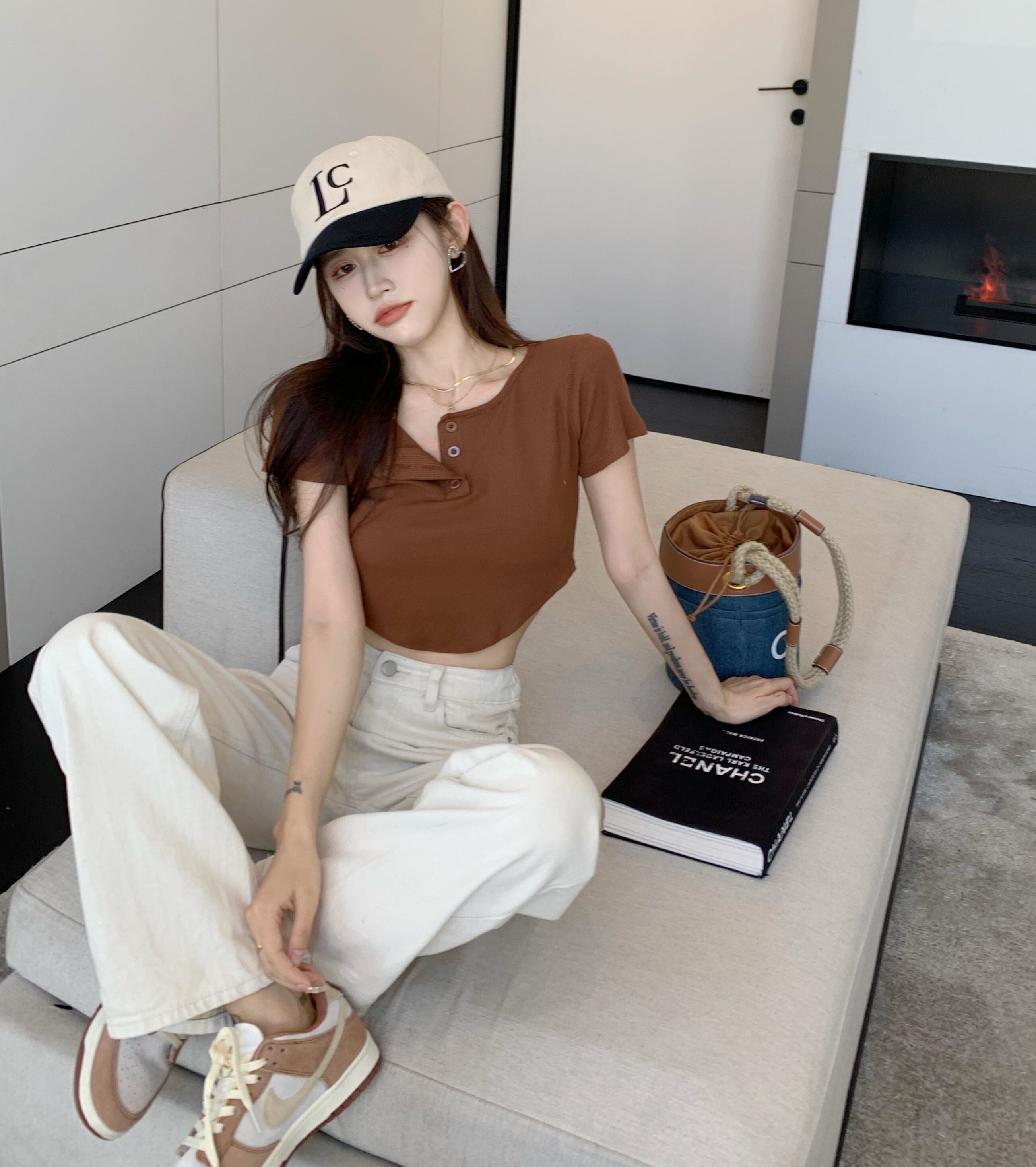 Tシャツ サマー薄手ハイウェストウェストショートスリムトップス 大人ガーリー スウィート キュート カジュアル 夏物 ヨーロピアン ブラックストロベリース23394512382
