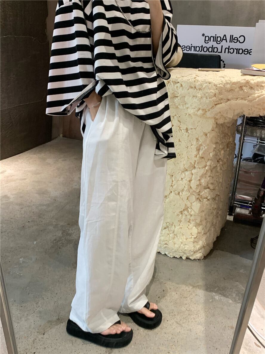 サマー薄手ブラックホワイトストライプTシャツ レディースカジュアルルーズロングトップス 夏物 ブラックストロベリース79171132054