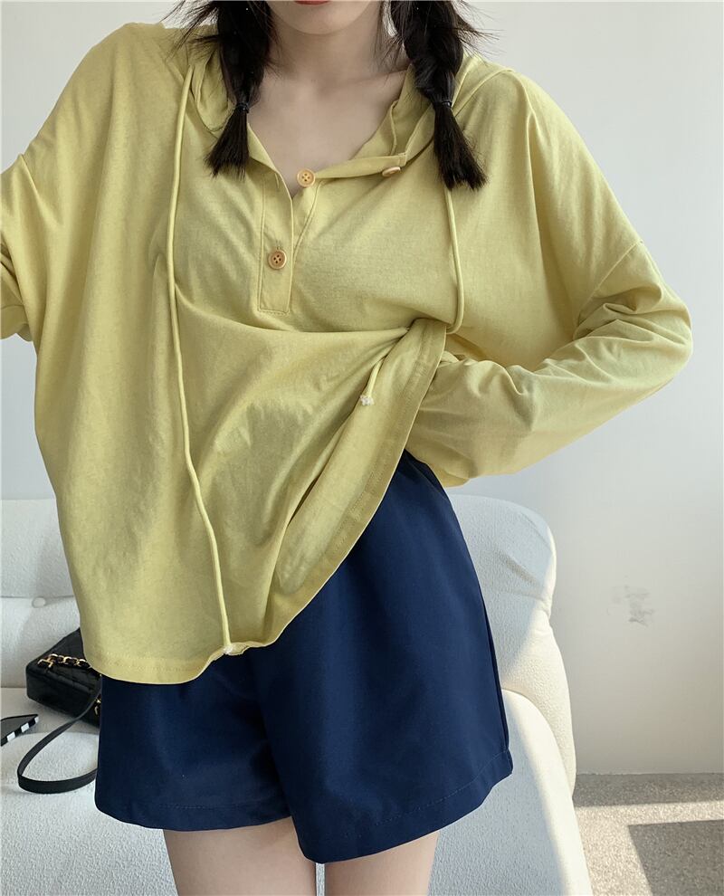 フードギャザーTシャツ オータム薄手イエローカジュアルルーズスリムトップス ロング 秋物 ブラックストロベリース43097902824