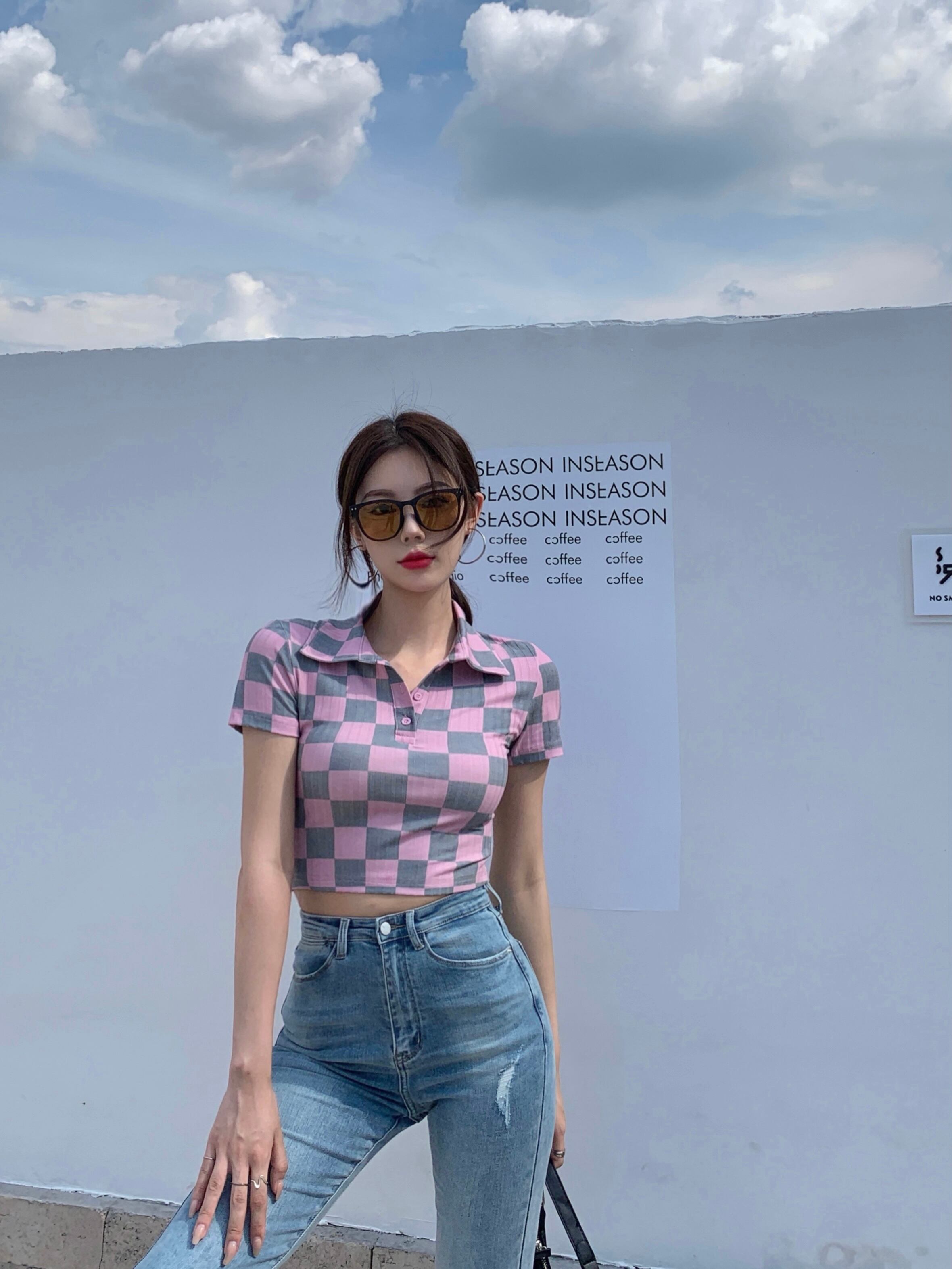スタンダード格子柄カラーTシャツ シャツ サマーショートハイウェストウェスト レトロ 夏物 ブラックストロベリース85284067569