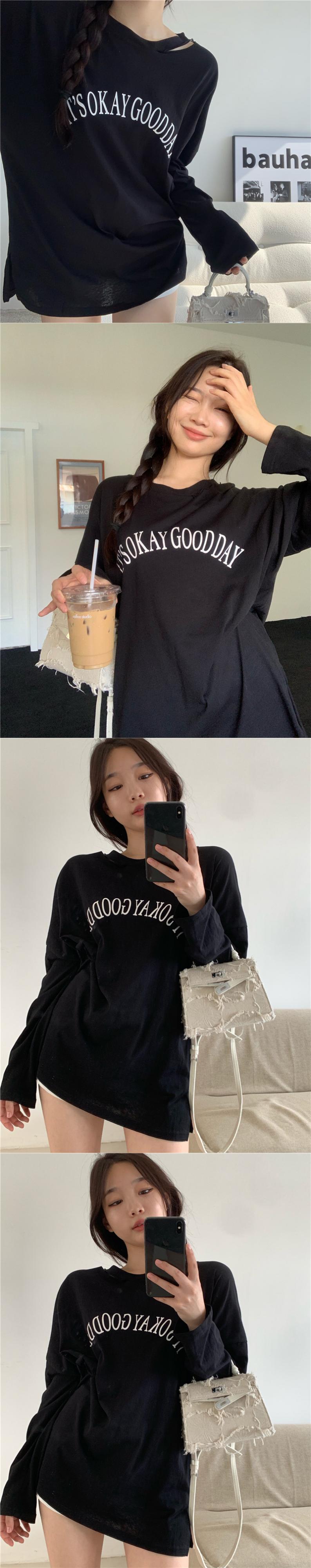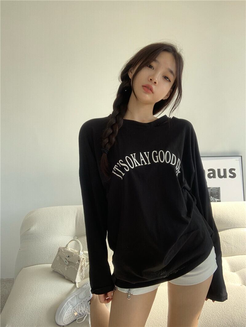Tシャツ シャツ ルーズブラック薄手スタイルトップス オータム ロング 秋物 ブラックストロベリース96115024144