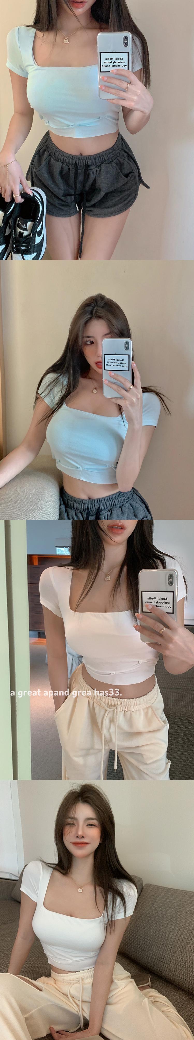 Tシャツ サマーショートハイウェストウェストカラートップス ピンク 夏物 ピュア スクウェア ブラックストロベリース83381372034