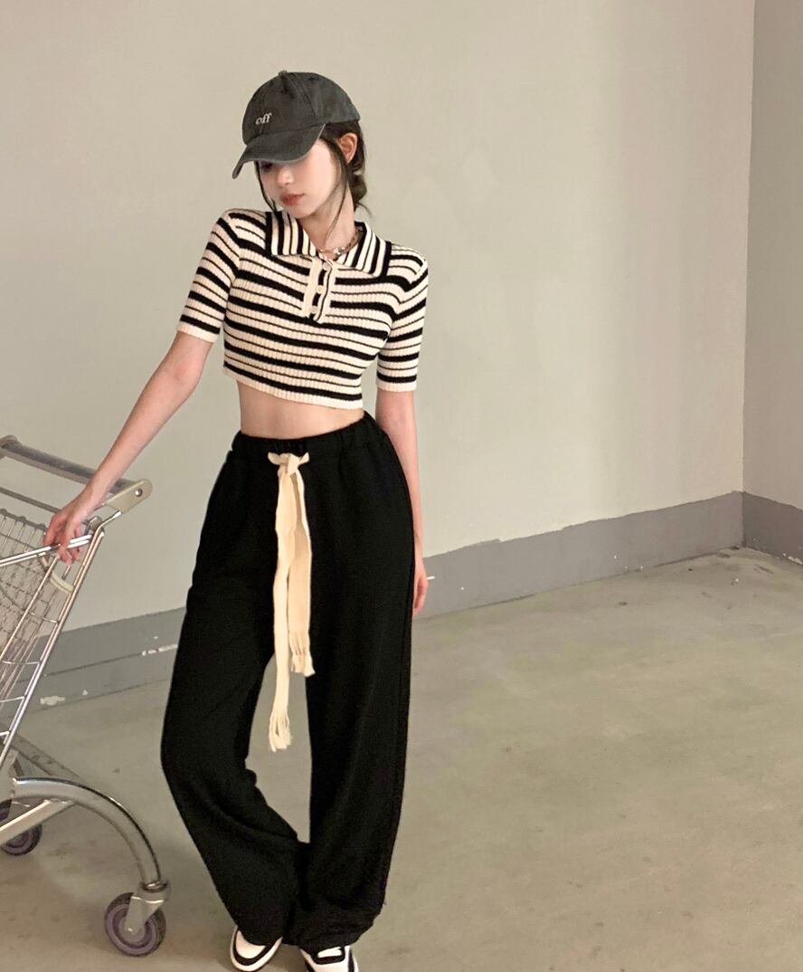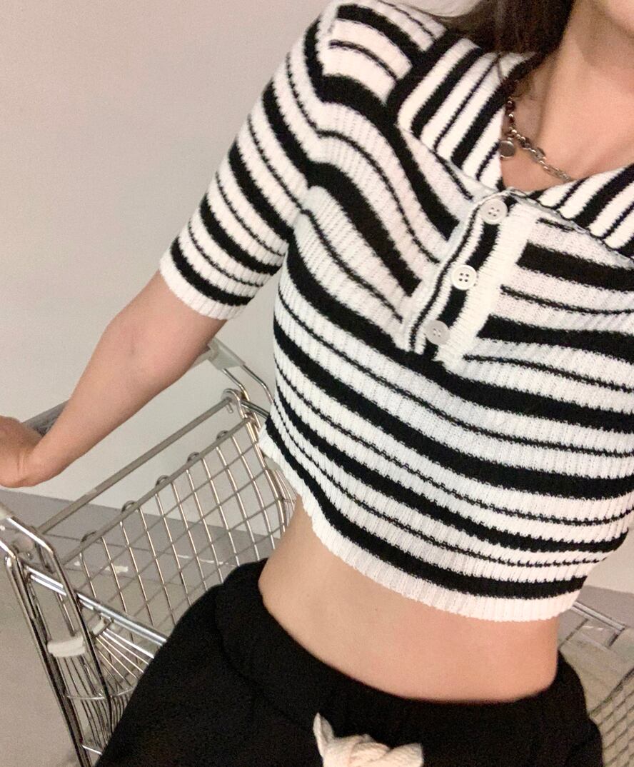 ストライプニットセーター カラー薄手ショートクロップドハイウェストウェストトップス サマースタイル 夏物 シルク ブラックストロベリース85083277383
