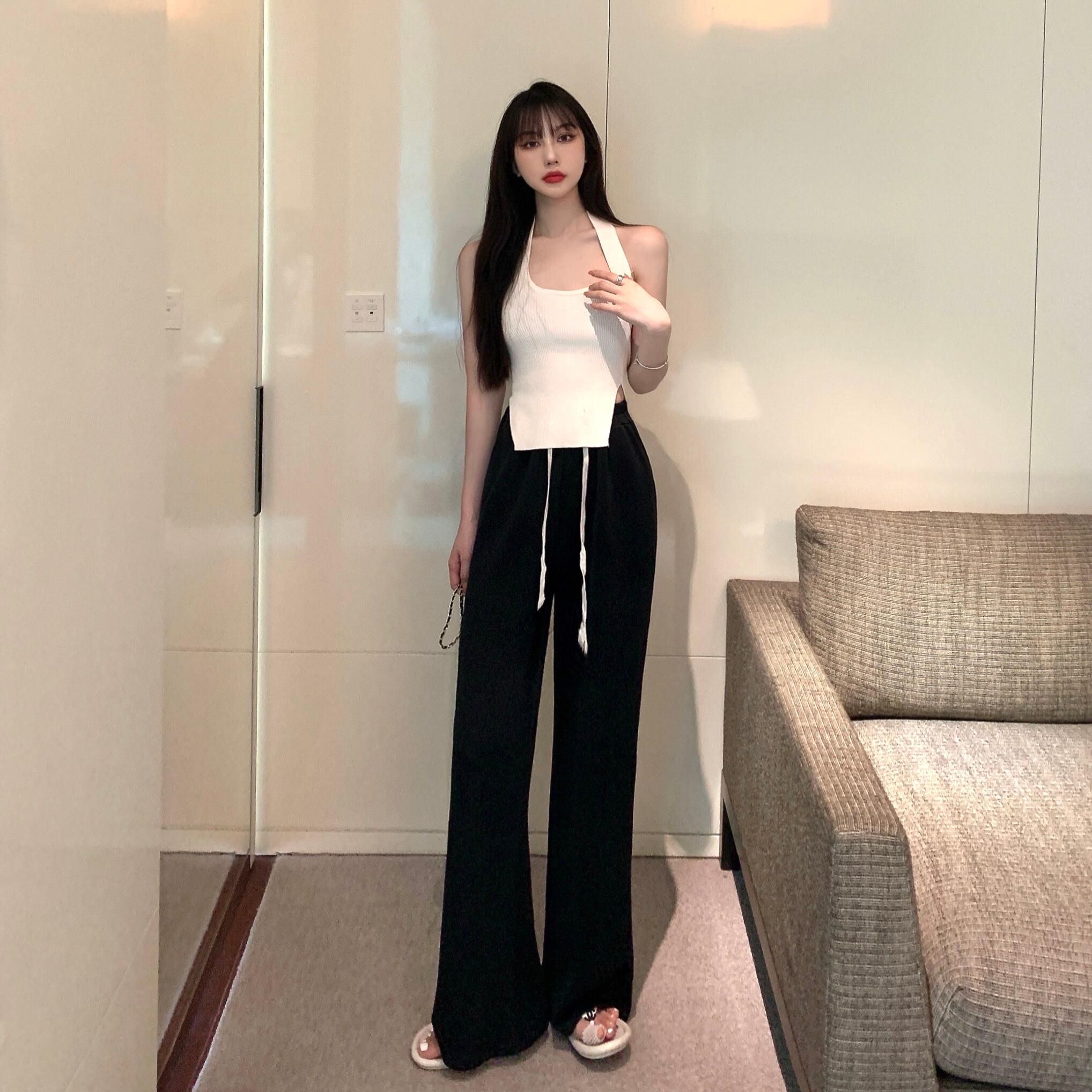 ワイドレッグパンツ レディースブラックルーズハイウェストウェストサマー薄手カジュアル 夏物 ワイドパンツ ブラックストロベリース26382160074