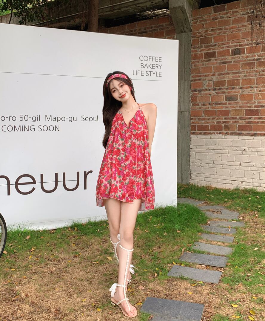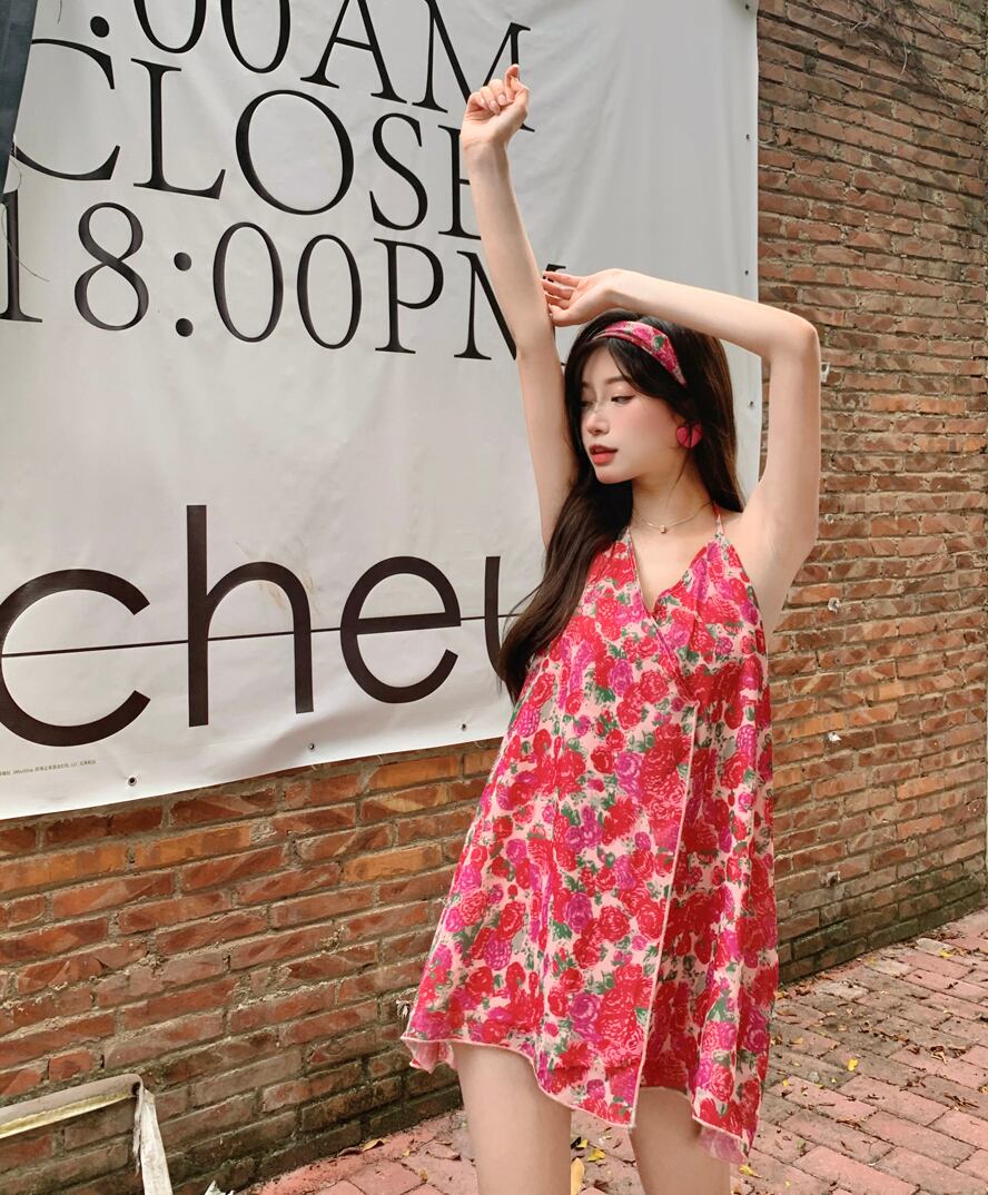 スカート ホルターフローラルドレス サマーショート 夏物 花柄 ブラックストロベリース3936430914