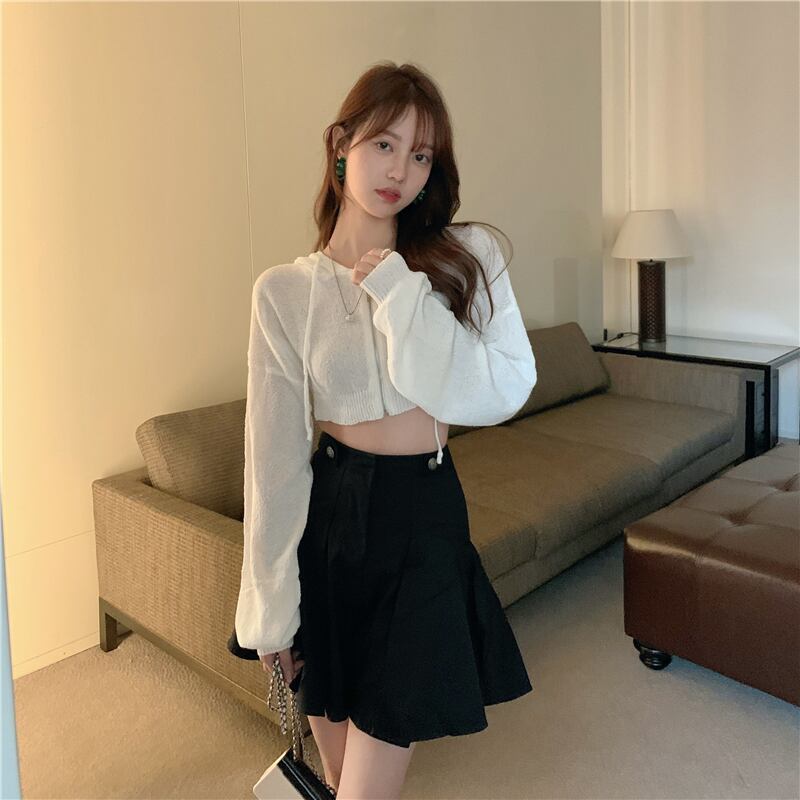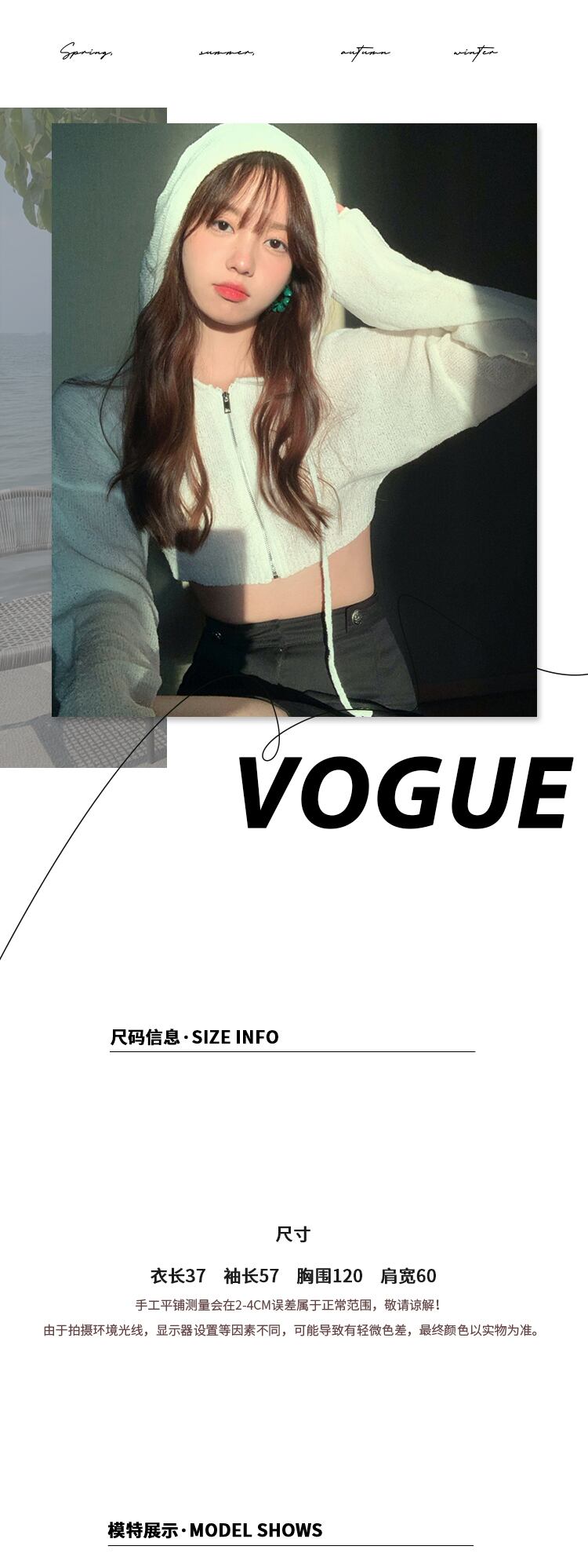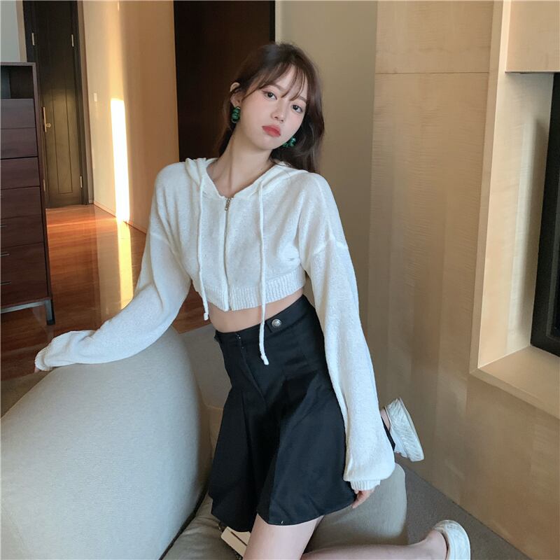 ニットセーター ショートホワイトフードカーディガンジャケット オータムジッパートップス 秋物 ピュア ブラックストロベリース87120002991