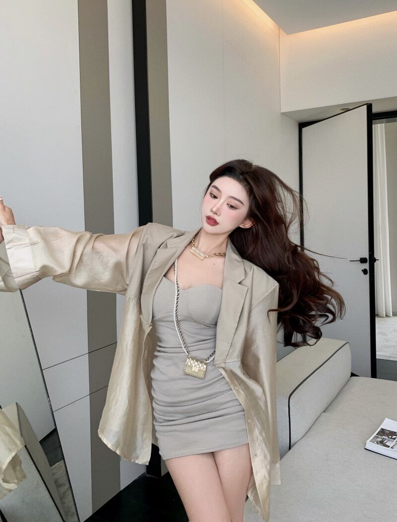 色:カーキ色のシャツ,白のシャツ,カーキキャミソール,ブラックサスペンダースカート
