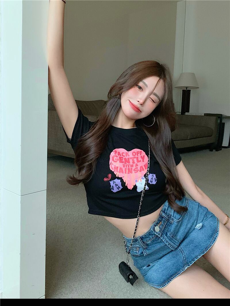 Tシャツ サマーショートスタイルハイウェストウェストスリムブラックトップス 大人ガーリー スウィート キュート カジュアル 夏物 ブラックストロベリース26798687667
