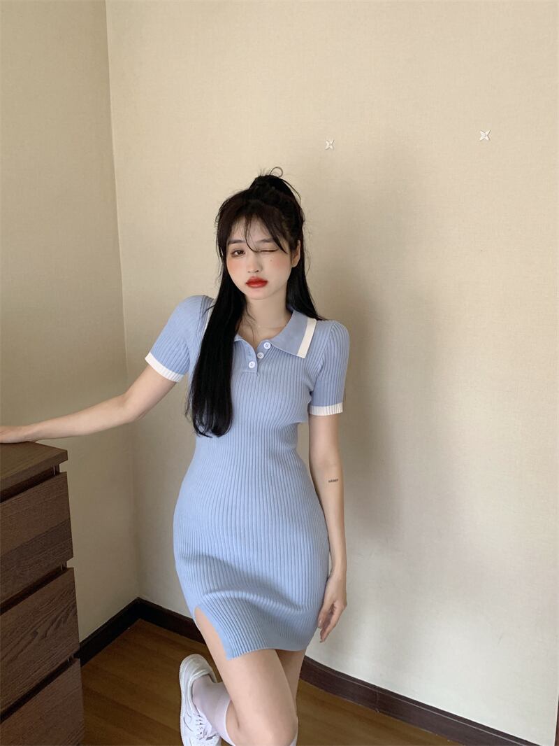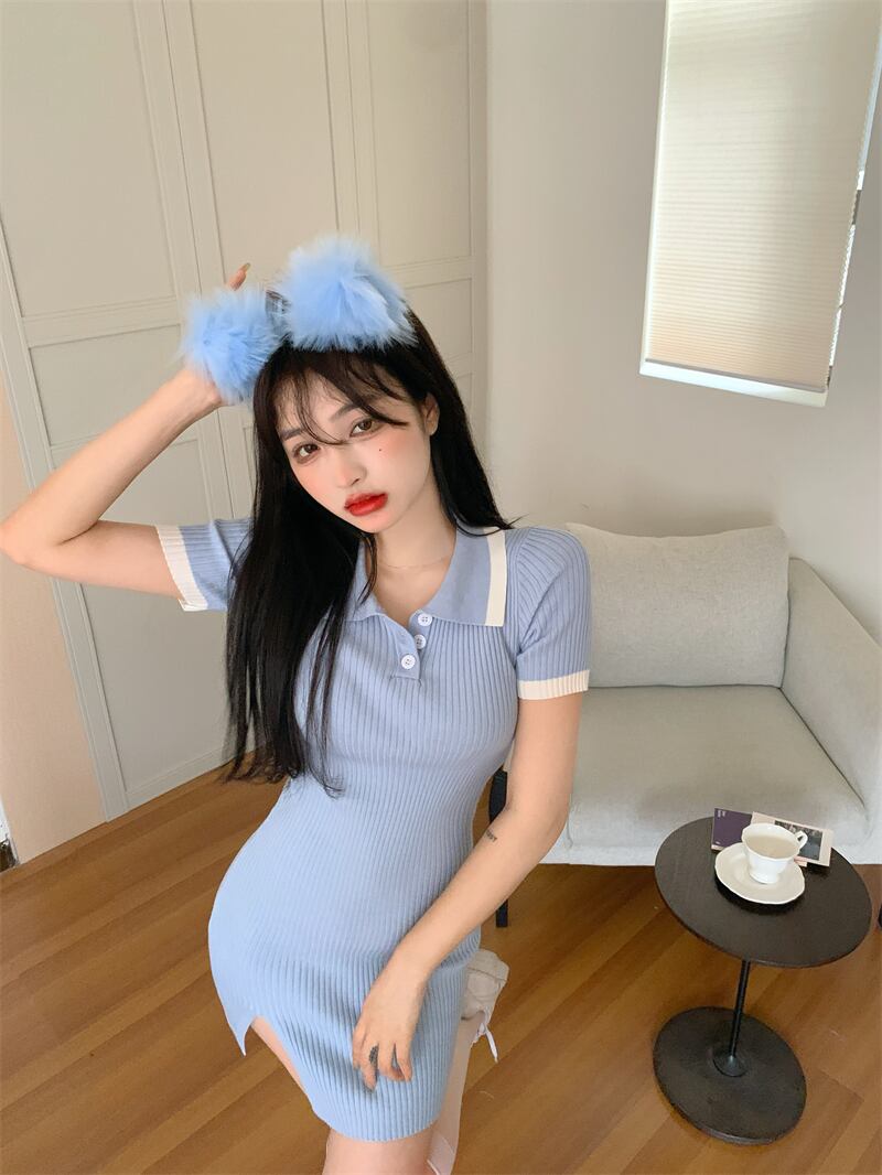 ニットドレス スリムウェストスカート サマーブルー 夏物 ブラックストロベリース94463145561