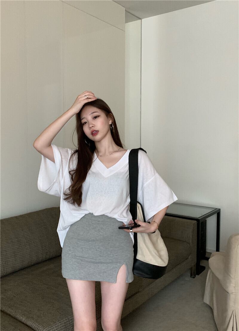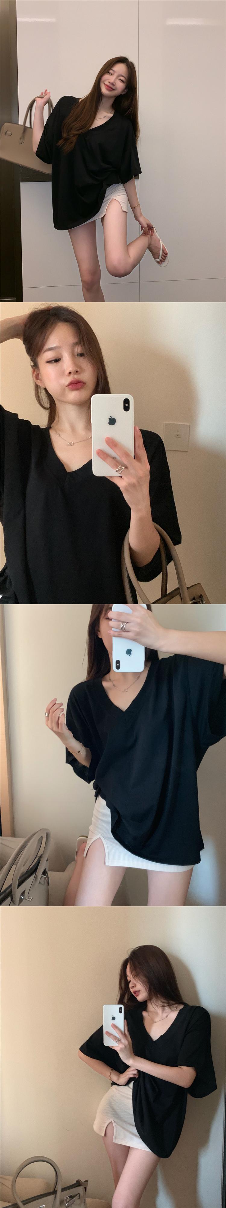 スタイルルーズカジュアル薄手VネックTシャツ サマーホワイトトップス ロング かわいい 夏物 ブラックストロベリース37547307580