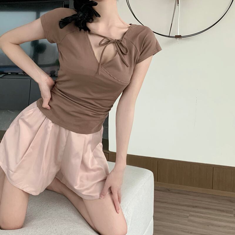Tシャツ サマーショートVネックスリムトップス 夏物 ブラックストロベリース55049689092