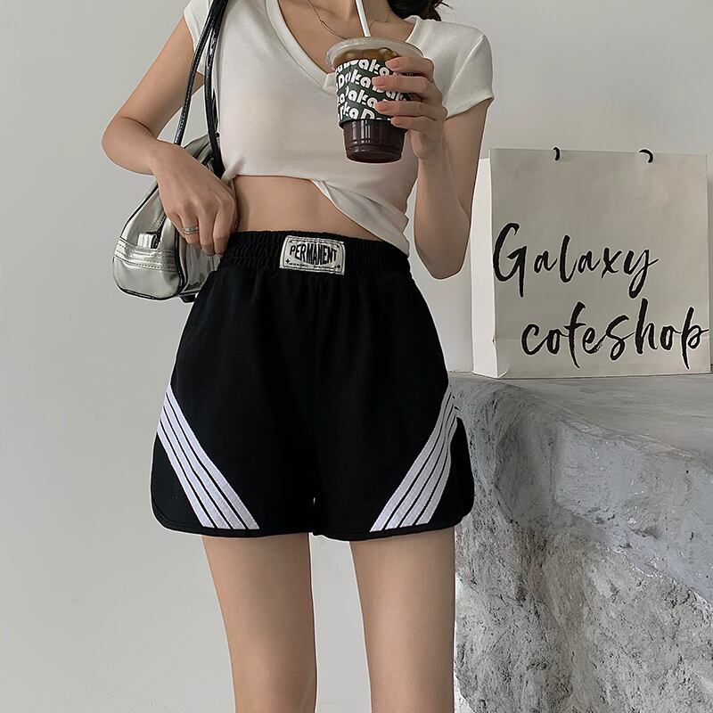 ストレッチウェストストライプカジュアルパンツ サマー薄手Aラインショーツ ハイウェストルーズワイドレッグ エラスティック 伸縮 夏物 ブルマー ワイドパンツ ブラックストロベリース52509601667