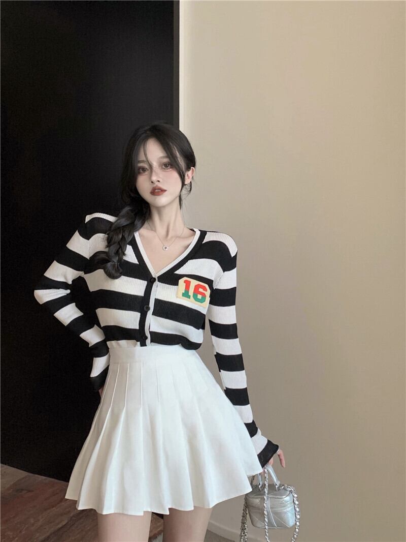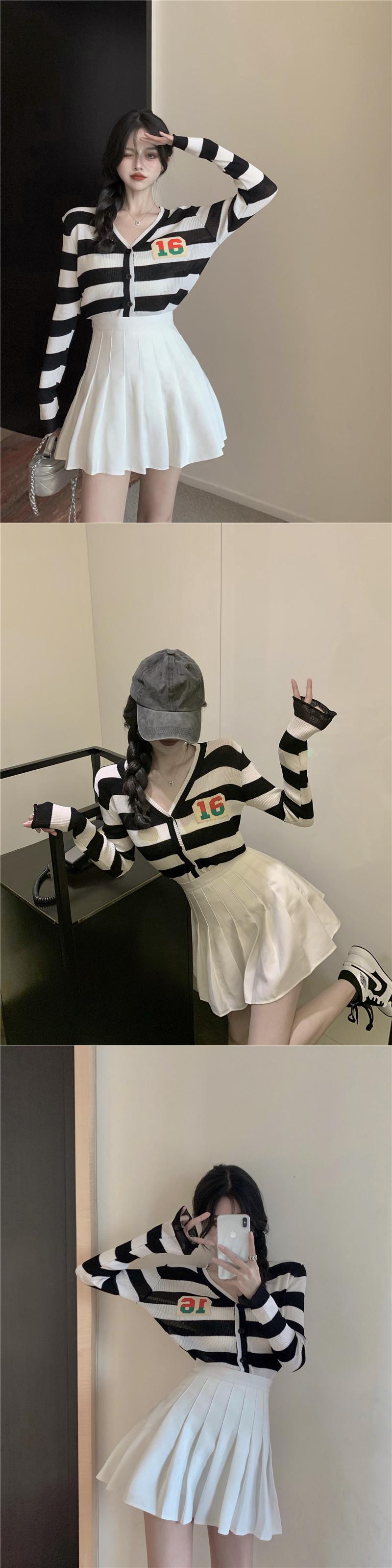 グリーンストライプニットカーディガンジャケット サマー薄手シャツ ショートトップス ロング 夏物 ブラックストロベリース42883040421