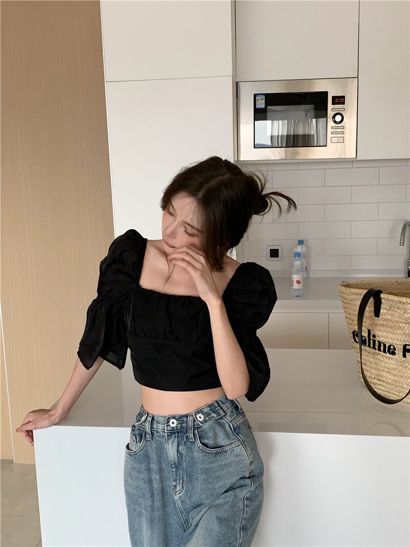 スリーブカラーシャツ サマー薄手ショートブラック半袖トップス ハーフスリーブ 夏物 スクウェア ブラックストロベリース54357266123