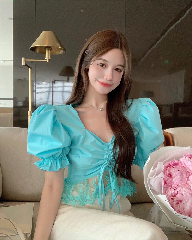レースシャツ スリーブショートサマーVネックブルートップス 夏物 ブラックストロベリース19312302962