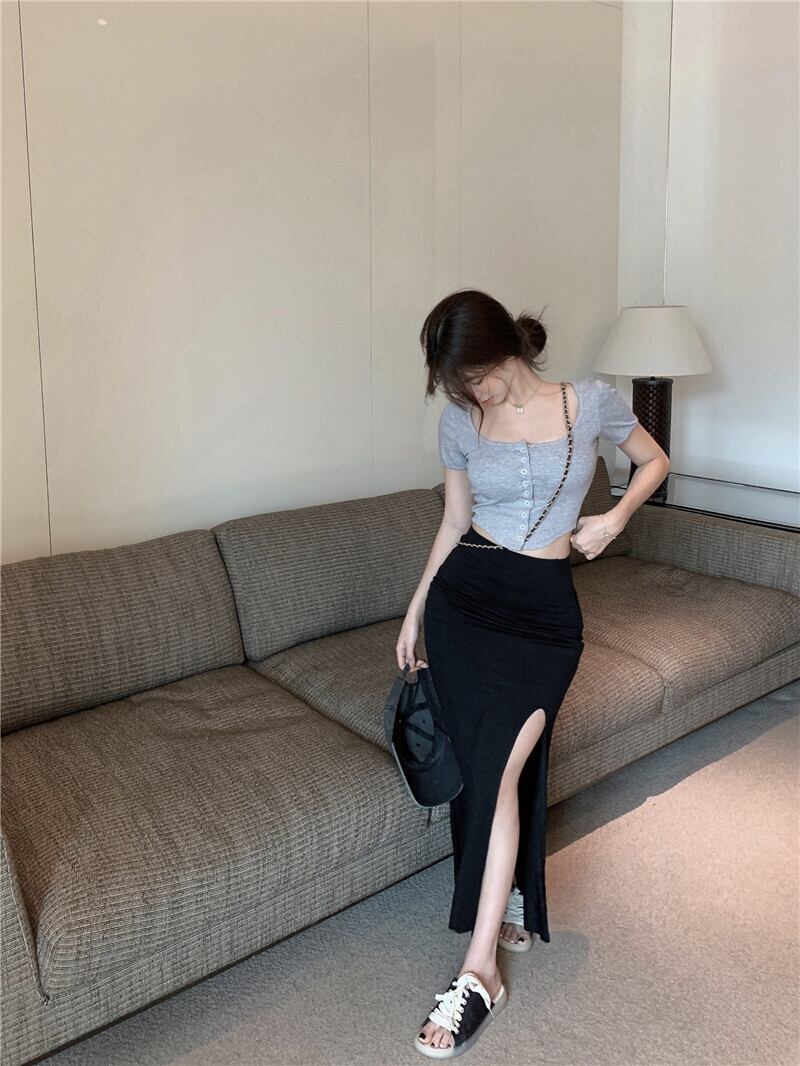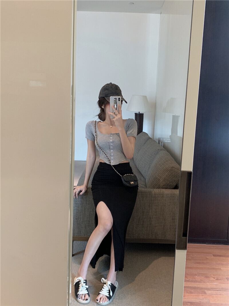 カラーTシャツ シャツ サマーショートハイウェスト 夏物 スクウェア ブラックストロベリース68614767139