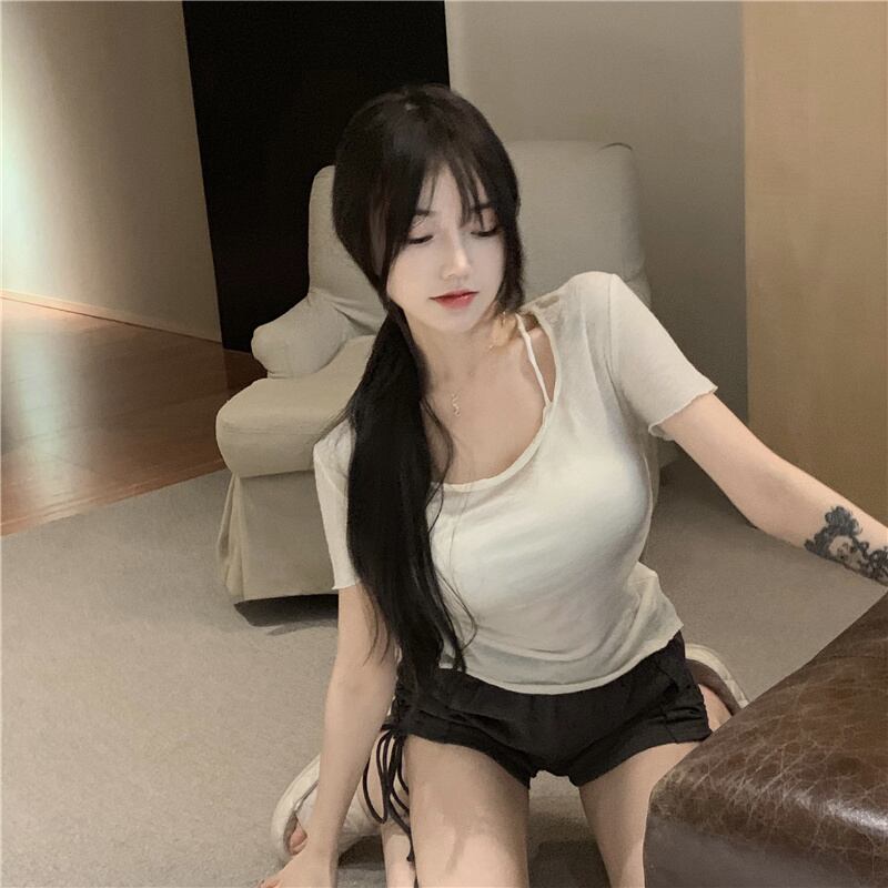 Tシャツ サマー薄手スリムショートトップス 大人ガーリー スウィート キュート カジュアル 夏物 ピュア ブラックストロベリース62998878496