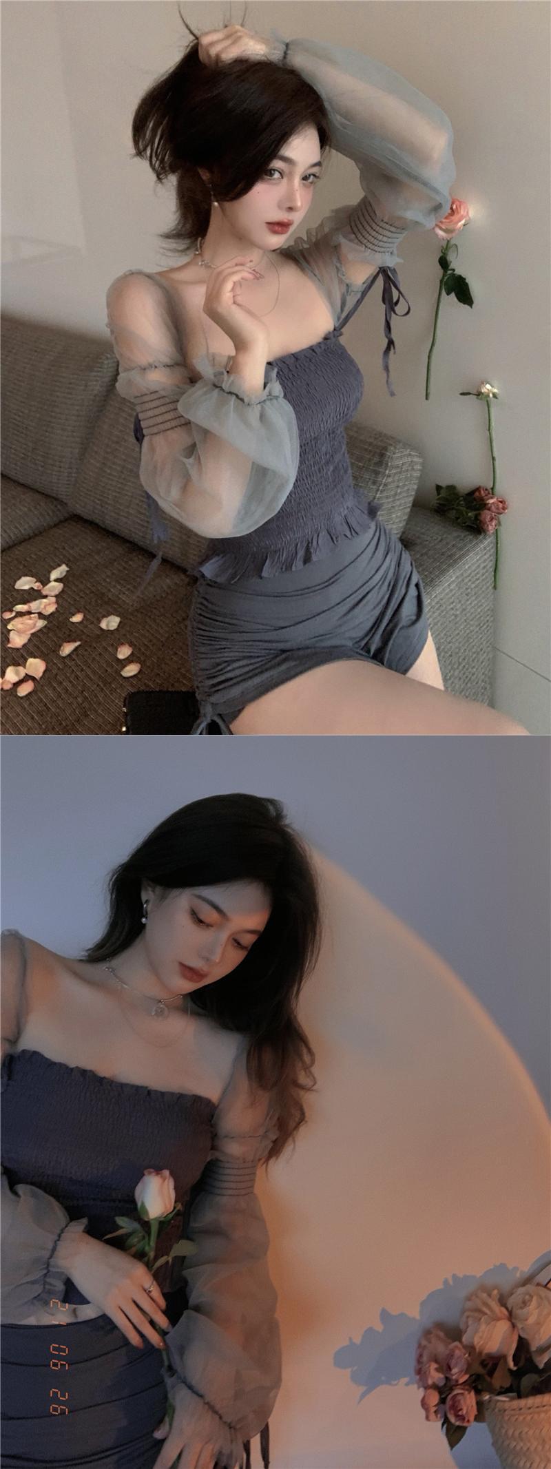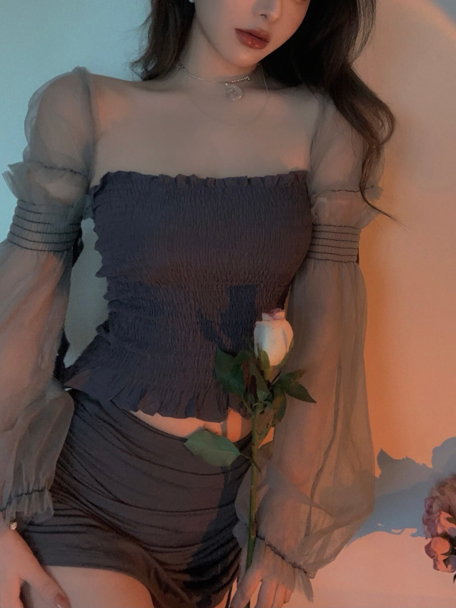 メッシュレースシフォンシャツ サマーショート薄手 ロング 大人ガーリー スウィート キュート カジュアル 夏物 ブラックストロベリース50580642053