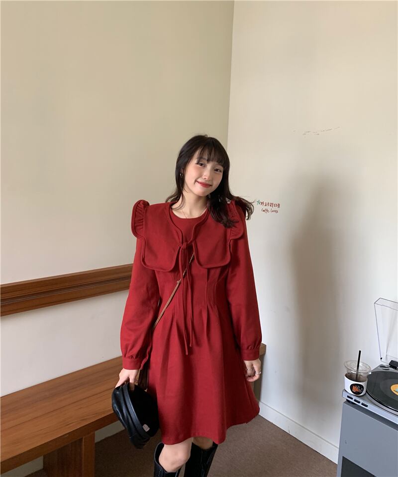 スタンダードドレス オータムウィンターレッドスカート ウェストショート ロング レトロ 秋物 冬物 ブラックストロベリース89931255447