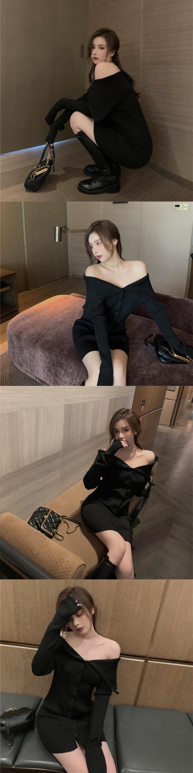ニットセーター ドレス スプリングオータムストラップレススカート ウェスト ロング 春物 秋物 ブラックストロベリース1709718365