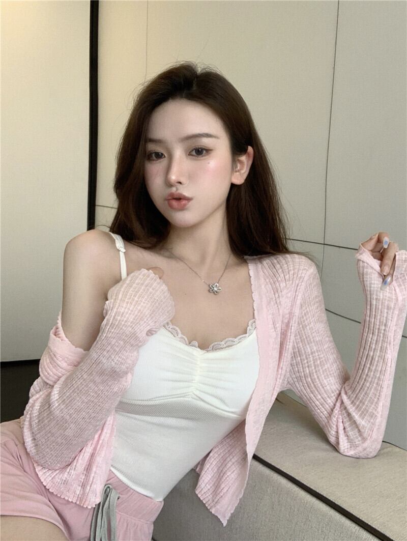 ニットカーディガンジャケット サマー薄手シャツ ショートトップス ロング ピンク 夏物 シルク ブラックストロベリース60001328058