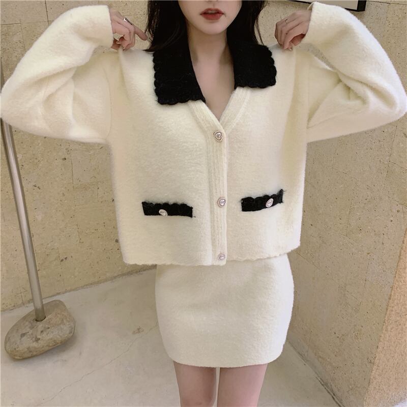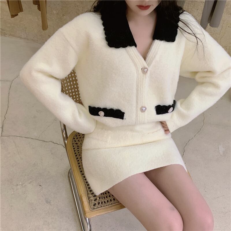 色:白と黒のステッチニットカーディガン,白と黒のステッチニットスカート