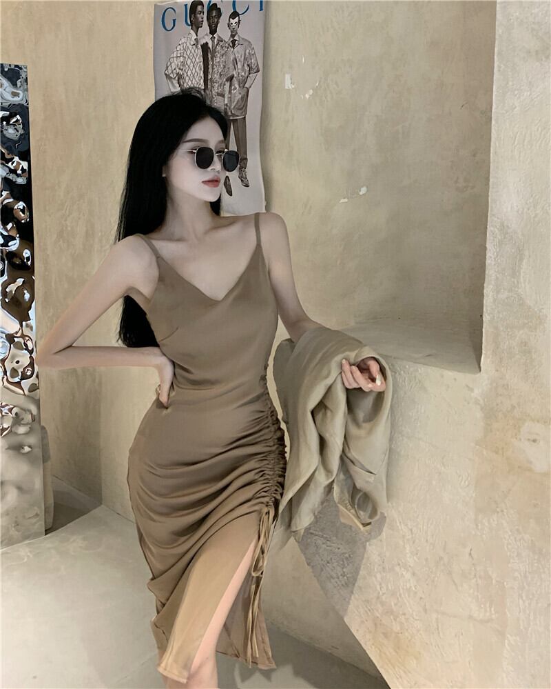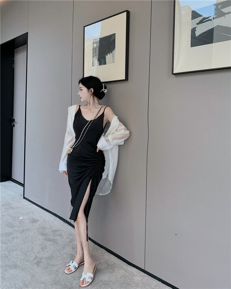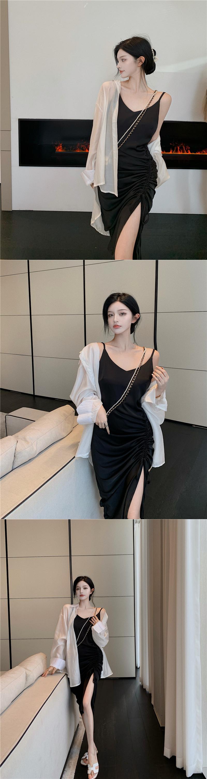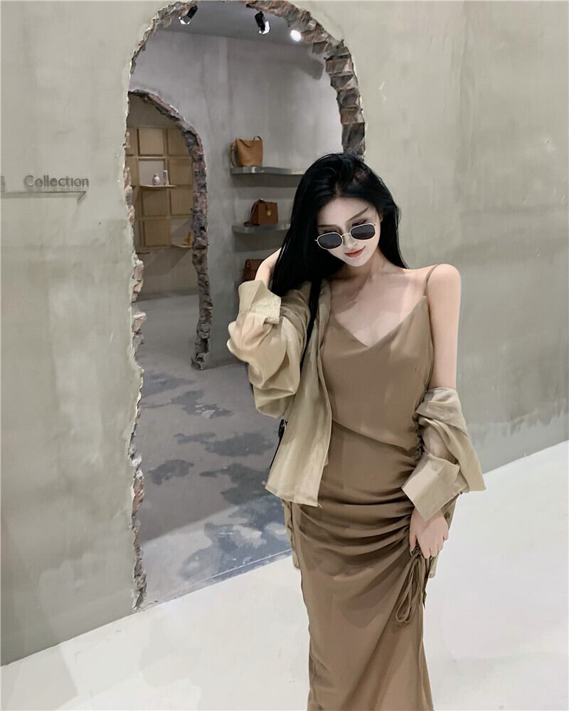 色:カーキ色のシャツ,カーキストラップドレス,白のシャツ,ブラックサスペンダースカート