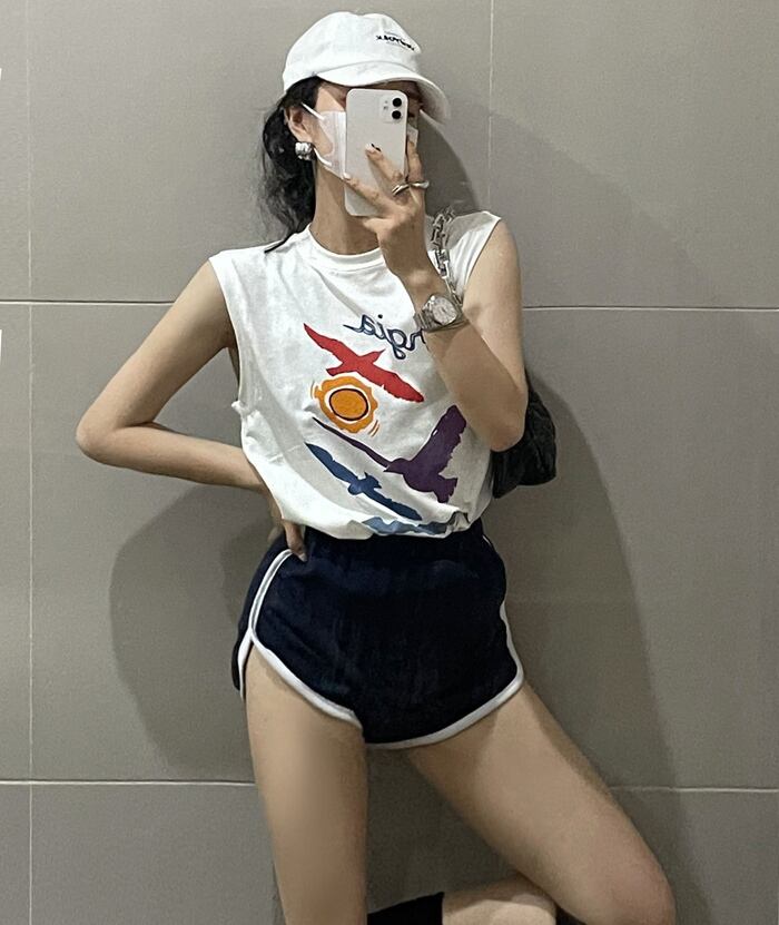 色:白いノースリーブ,ダークブルーのショートパンツ