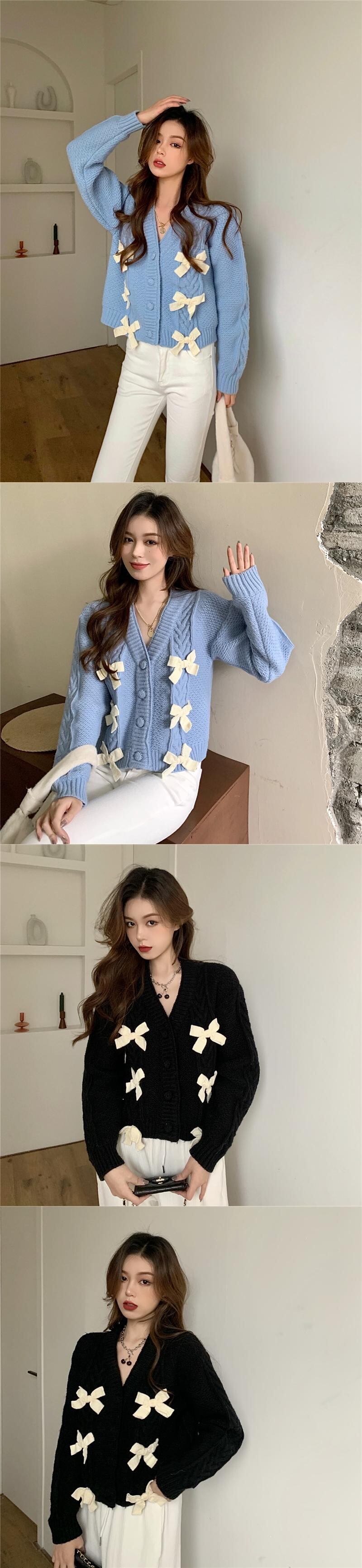セーター ショートルーズニットトップス スプリングオータムリボンブルーカーディガンジャケット 春物 秋物 ブラックストロベリース30026588223
