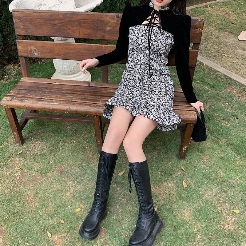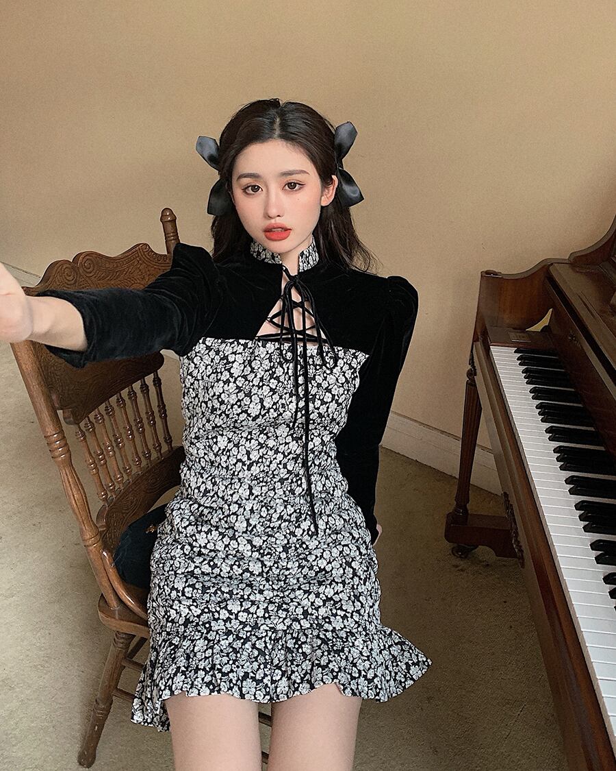 フローラルスカート ドレス スプリングウェストショート ロング 春物 花柄 ブラックストロベリース9714479835