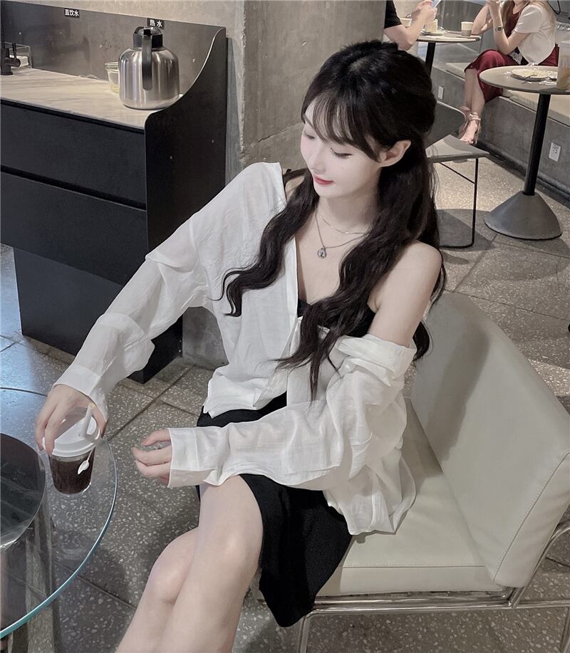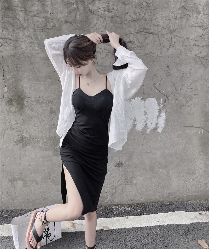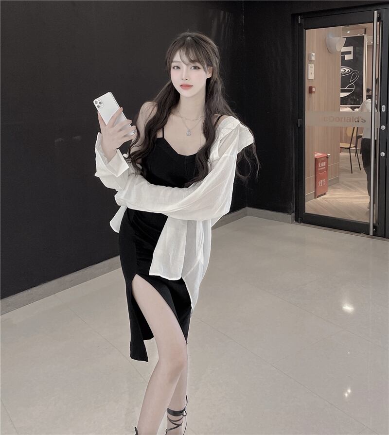 色:ブラックサスペンダースカート,白のシャツ