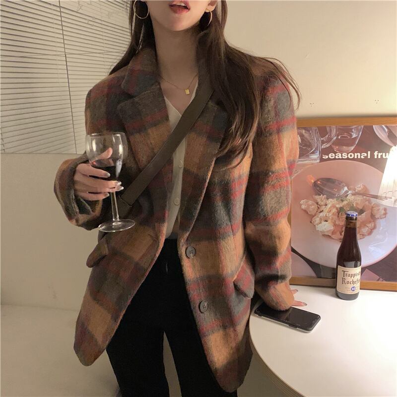 スタンダード格子柄ジャケット スプリングオータムルーズカジュアル レトロ 春物 秋物 ブラックストロベリース37840070446