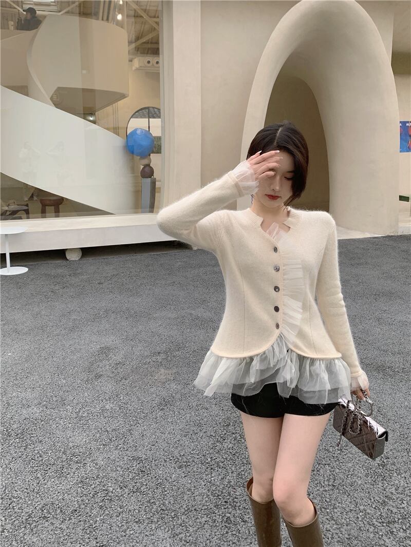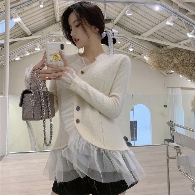 セーター スリムVネックニットトップス オータムウィンターメッシュカーディガンジャケット 秋物 冬物 ステッチ ブラックストロベリース78810003347