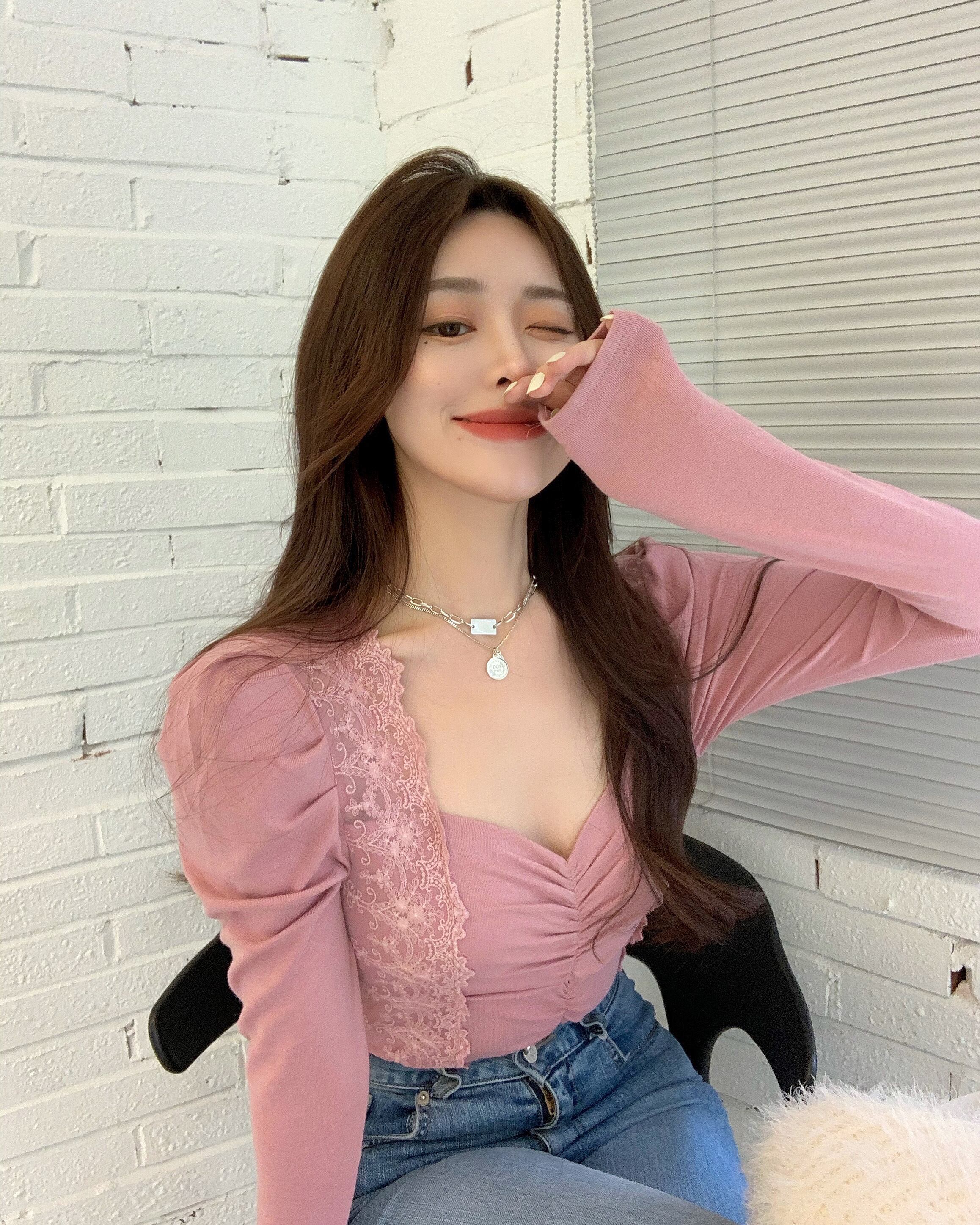 Tシャツ シャツ レーススリムオータムウィンタートップス ロング 秋物 冬物 ステッチ ブラックストロベリース8708601407