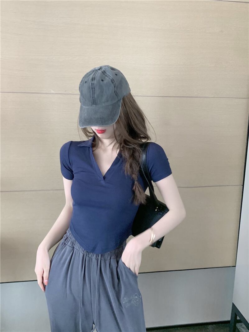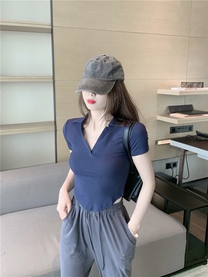 Tシャツ サマー薄手ショートスリムVネックトップス 夏物 ブラックストロベリース31019508916