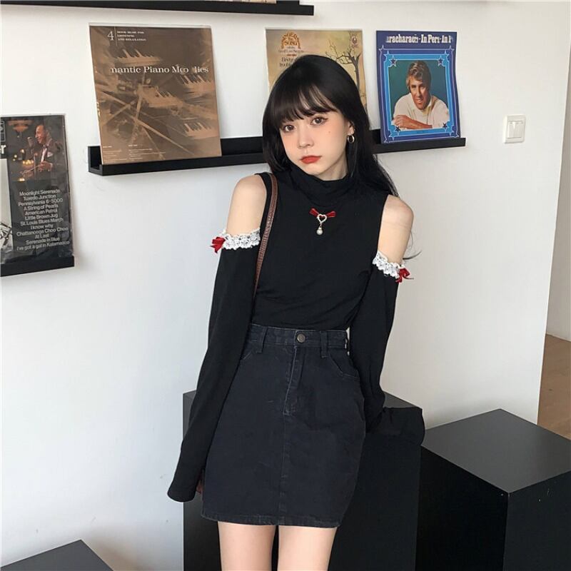 レースシャツ Tシャツ スプリングスリムショートトップス ロング 春物 オフショルダー ブラックストロベリース42859435347