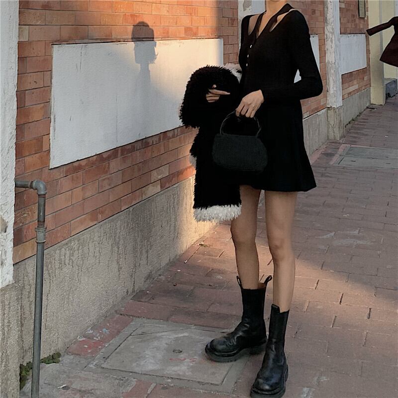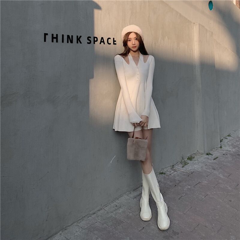 ニットドレス ウェストショートスカート オータムウィンター ロング 秋物 冬物 オフショルダー ブラックストロベリース50515028262